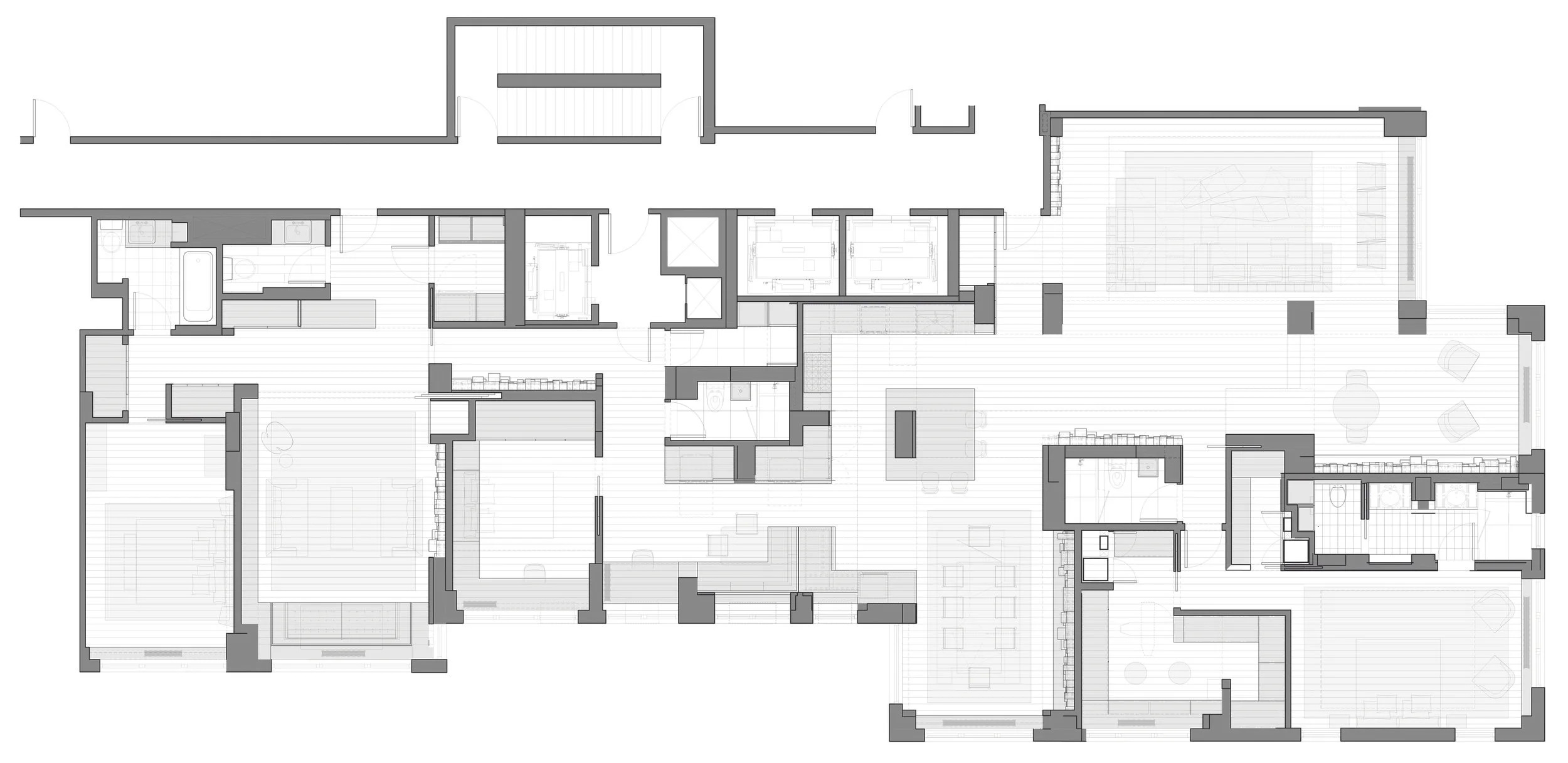 The project is gut renovation of a 1960’s apartment in New York. The apartment was littered with low hanging beams and columns. A concept of framing views and spaces was used to organize existing structural elements and tie together the rooms in a way that allowed them to be both connected to each other and also well defined. Walking through the space is like moving through a series of still movie images.